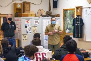 Saúl Martín of AWC (right) talks with students at Desert Oasis High School on Friday, October 22 with Instructor Tim Wenzel (left). Martín and a team of industry professionals led the students through a project to learn about joinery techniques.