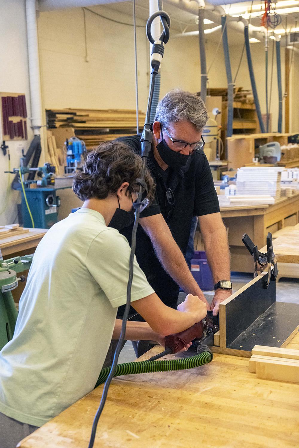 October 28, 2021, Anaheim, CA — Desert Oasis High School in Las Vegas hosted eleven industry guests on Friday, October 22 for a special “MFG Day” (Manufacturing Day) event. The guests led three periods of instructor Tim Wenzel’s woodworking program through a project featuring current industry joinery techniques and shared information about their careers in the industry with the students.