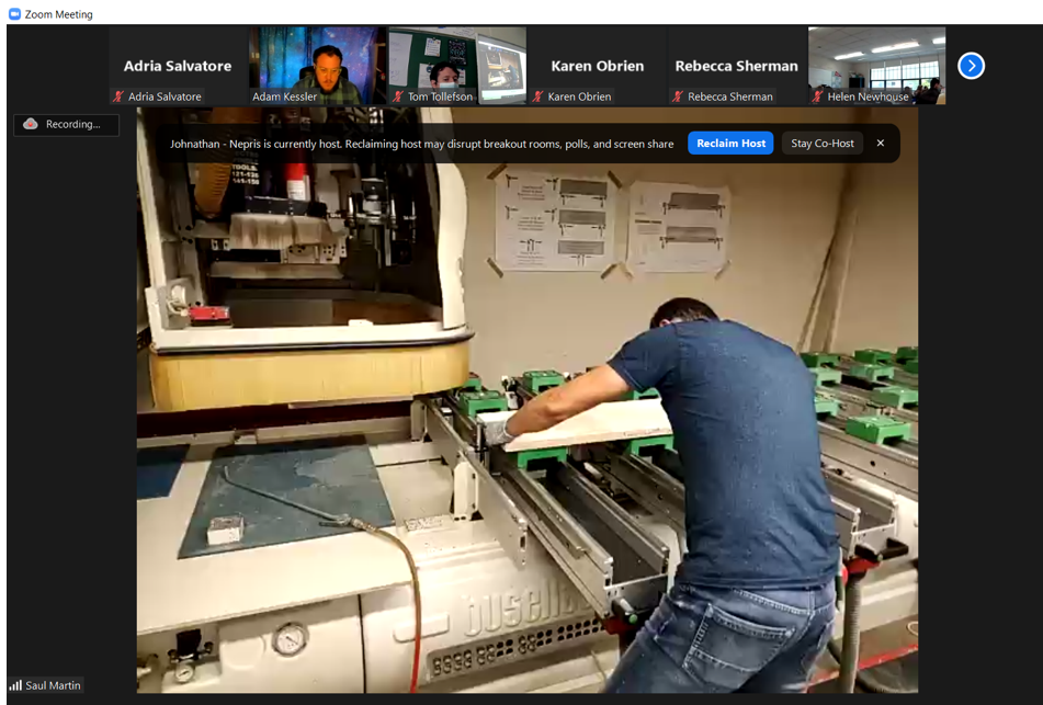On Friday, October 29, Saúl Martín of Architectural Woodworking Company (AWC) provided a live virtual tour of AWC’s manufacturing facility for a group of 7th grade students in Hudson, New Hampshire. The students saw machinery in action including the CNC machine and the shaper. They also saw shop drawings and parts for some complex AWC projects. Martín explained how the CNC machine worked by using a skateboard blank and finished product as an example, which was a tangible concept for the students. “The shop tour was informative for our students,” says Hudson School District Career Development Coordinator Richard Paiva. “And highlighting the skateboard was a huge plus as the students can relate to it directly.”